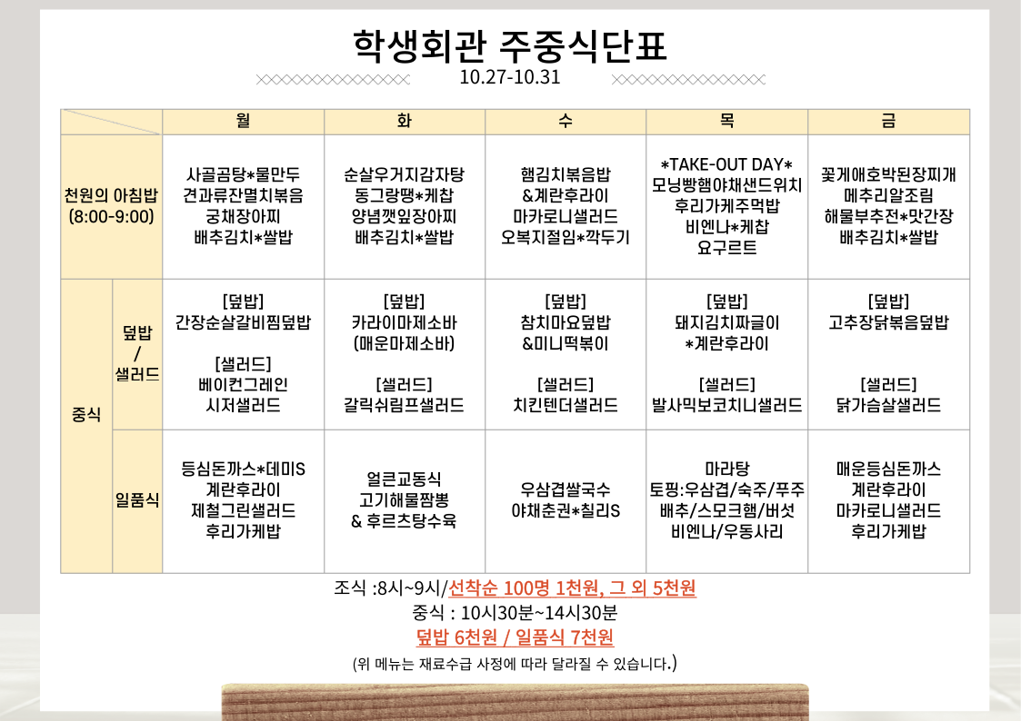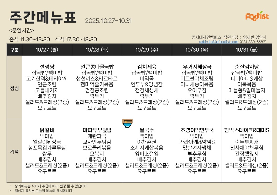 [자연] 2025년 10월 27일 ~ 10월 31일 식단표 (명진당학생회관,방목관,생활관)
