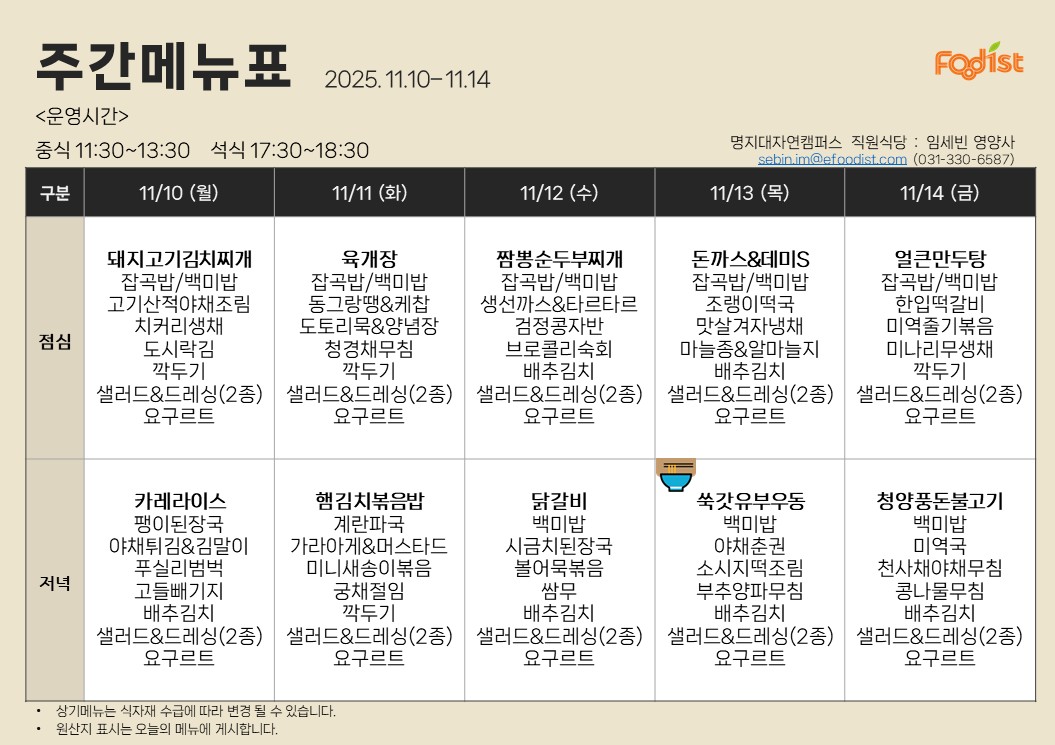 [자연] 2025년 11월 3일 ~ 11월 7일 식단표 (명진당, 학생회관, 방목관, 생활관)