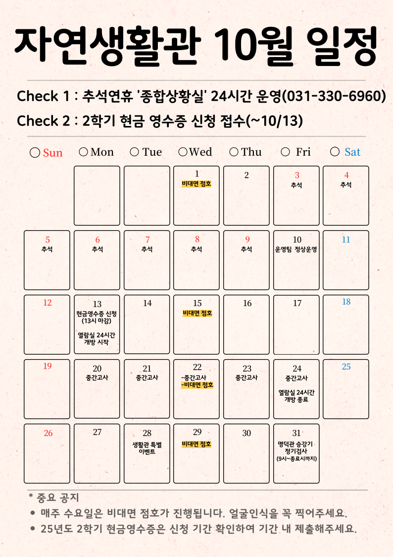 [공통] 추석연휴 점호 안내 / 中秋连休当面点名通知/ Notice on In-Person Roll Call During Chuseok Holiday김*덕 2025-09-29 16:27:05.0