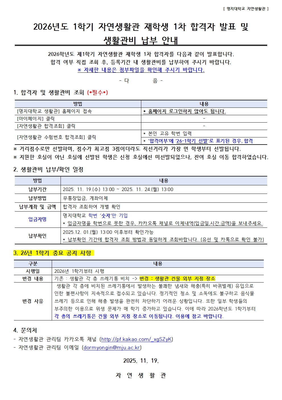 [자연] 2026년도 1학기 자연생활관 재학생 1차 합격자 발표 안내