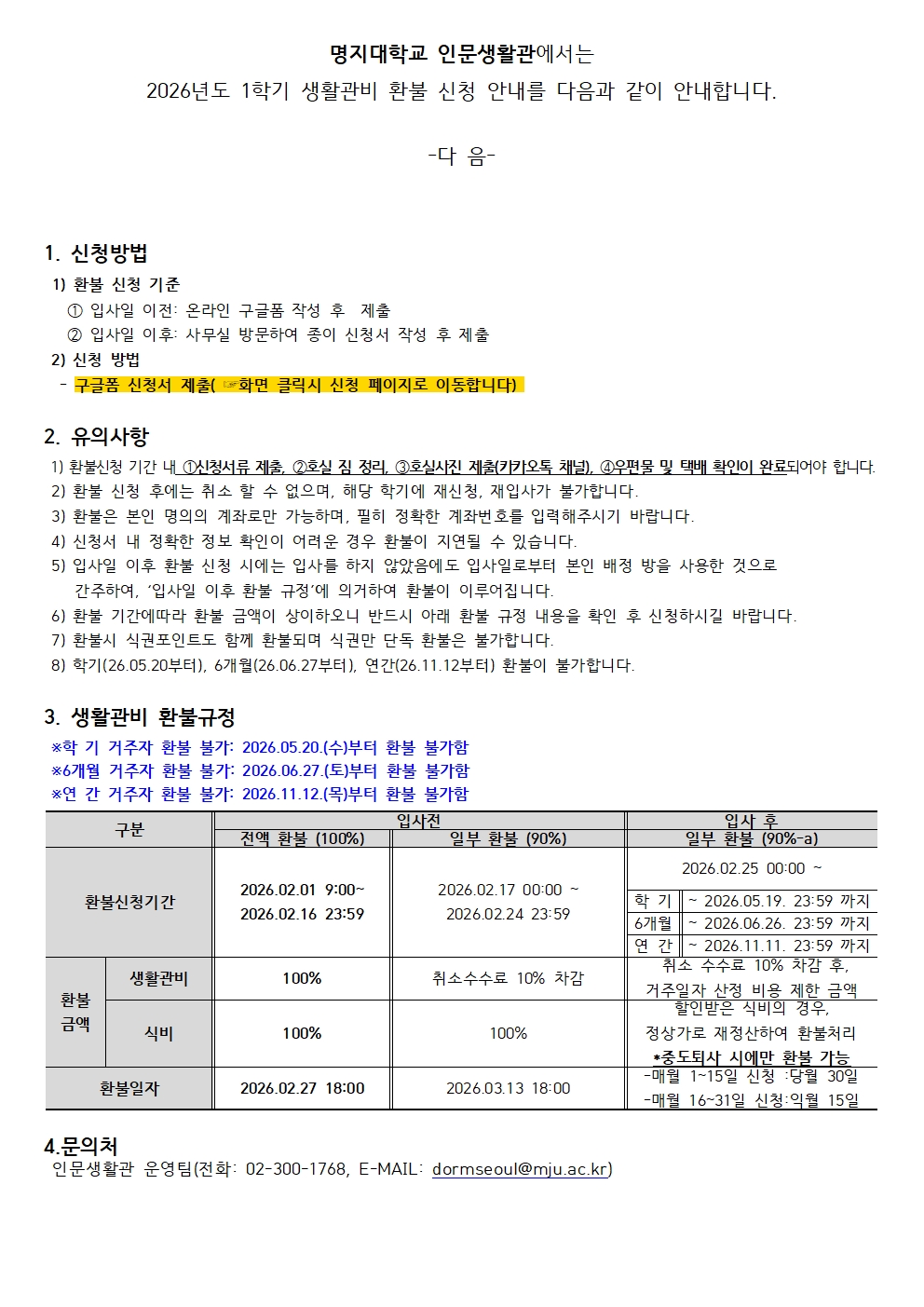 fnctId=bbs,fnctNo=1185 [인문] 2026년도 1학기 인문생활관 환불 신청 안내 분류인문 작성일2026.01.30 수정일2026.01.30 작성자 김*덕 조회수438 첨부파일 첨부파일이(가) 없습니다. 다음글 [인문] ♥2026년도 1학기 인문생활관 입사 안내문 김*덕 2026-01-30 20:51:56.0 이전글 [인문] 인문생활관 2025년도 연간거주자 퇴사 안내 김*덕 2026-01-30 20:24:33.0