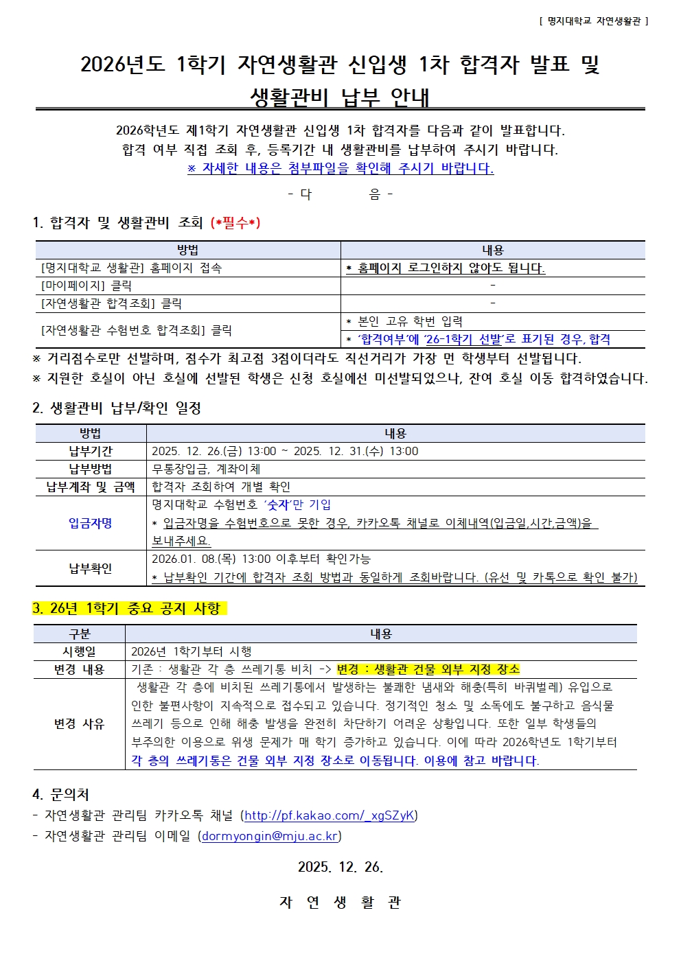 [자연]2026년도 1학기 자연생활관 신입생 1차 합격자 발표 안내