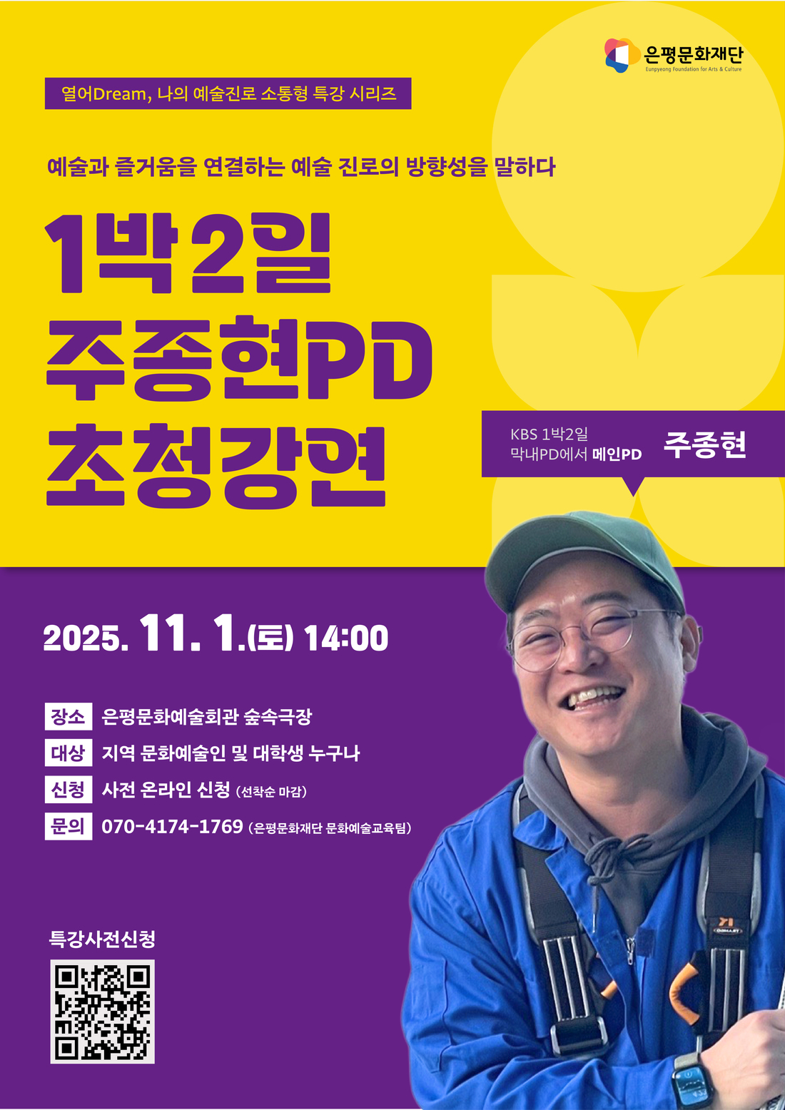 (재)은평문화재단에서는 대학생을 대상으로 예술적 표현과 감수성을 중심으로 예술교육과 문화적 다양성과 소통을 강조하는 문화교육을 융합한 교육적 경험을 제공하기 위한 문화예술 진로체험 추진하고 있습니다. 2025. 11. 1.(토) 14:00에 현 1박2일 주종현PD의 특강을 추진하고자 하오니 많은 관심 바랍니다.